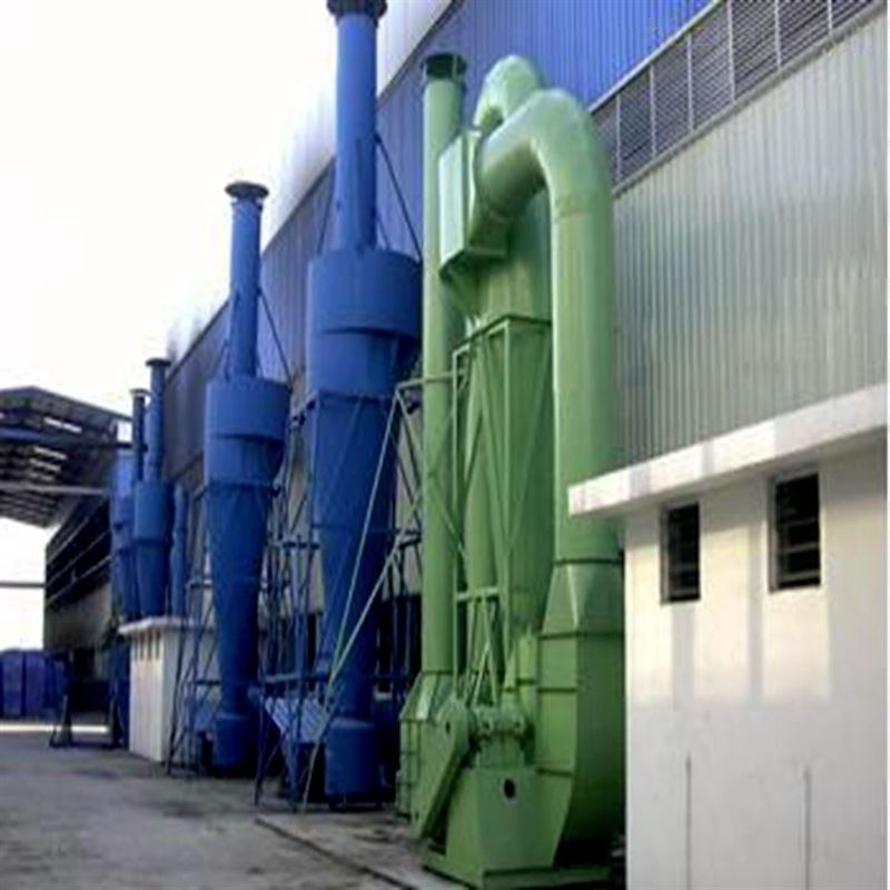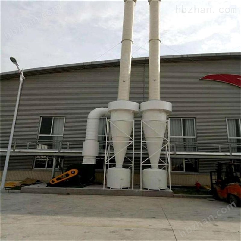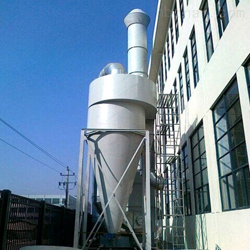 旋风除尘器 是由进气管、排气管、圆筒体、圆锥体和灰斗组成。旋风除尘器结构简单,易于制造、安装和维护管理,设备投资和操作费用都较低,已广泛用于从气流中分离固体和液体粒子,或从液体中分离固体粒子。在普通操作条件下,作用于粒子上的离心力是重力的5~2500倍,所以旋风除尘器的效率显著高于重力沉降室。利用这一个原理基础成功研究出了一款除尘效率为百分之九十以上的旋风除尘装置。在机械式除尘器中,旋风式除尘器是效率较高的一种。它适用于非黏性及非纤维性粉尘的去除,大多用来去除5μm以上的粒子,并联的多管旋风除尘器装置对3μm的粒子也具有80~85%的除尘效率。选用耐高温、耐磨蚀和腐蚀的特种金属或陶瓷材料构造的旋风除尘器,可在温度高达1000℃,压力达500×105Pa的条件下操作。从技术、经济诸方面考虑旋风除尘器压力损失控制范围一般为500~2000Pa。因此,它属于中效除尘器,且可用于高温烟气的净化,是应用广泛的一种除尘器,多应用于锅炉烟气除尘、多级除尘及预除尘。